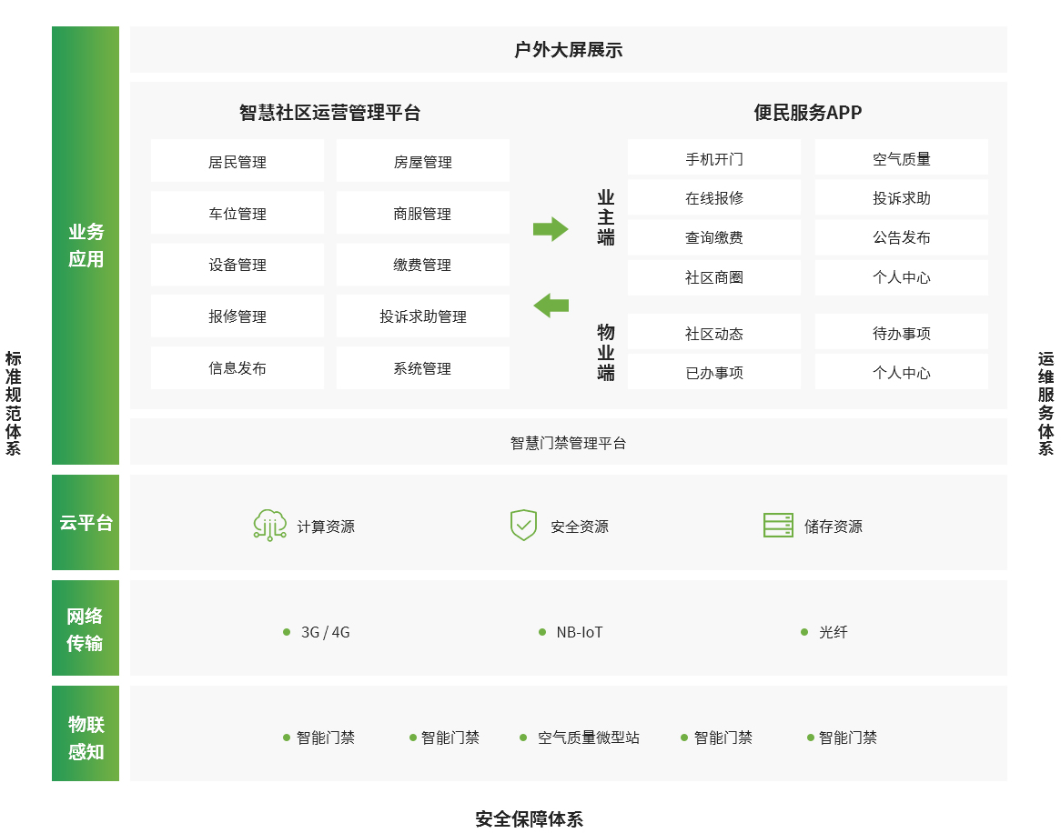 本項目采用先進、開放、標準、主流、成熟的基礎平臺、開發手段與信息技術規范,滿足智慧社區對平臺建設先進性、開放性、標準化、穩定性、可擴展性的需要。按照公共安全、物業管理和便民服務的基本功能需求,共包括物聯感知層、網絡傳輸層、云平臺層、業務應用層四個層次。